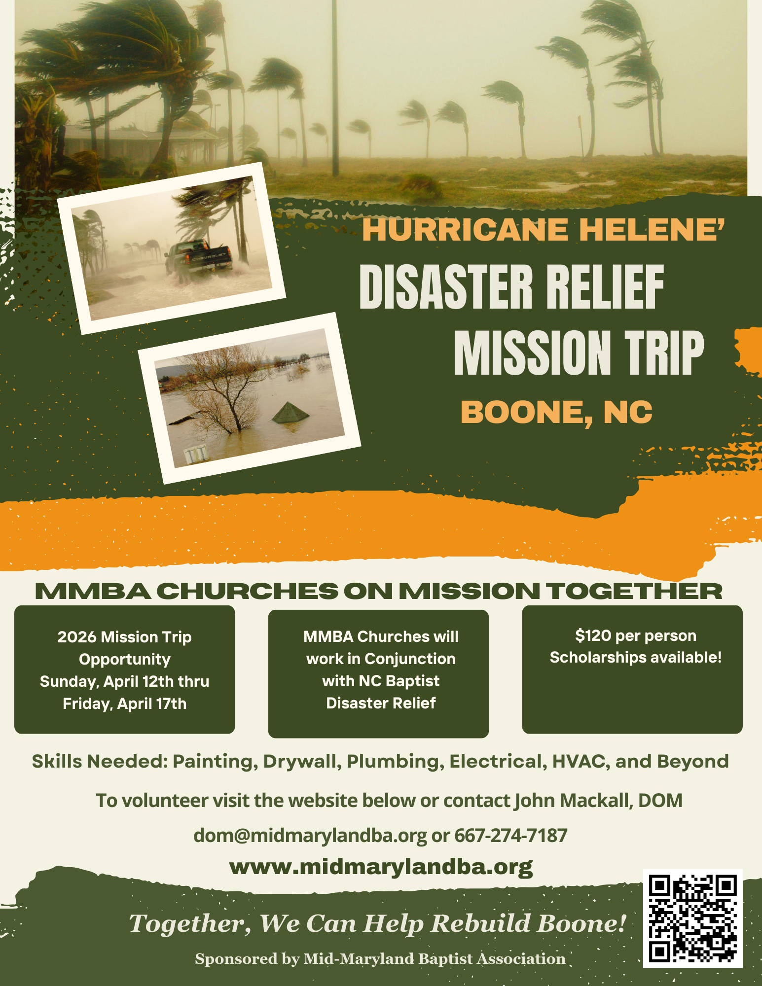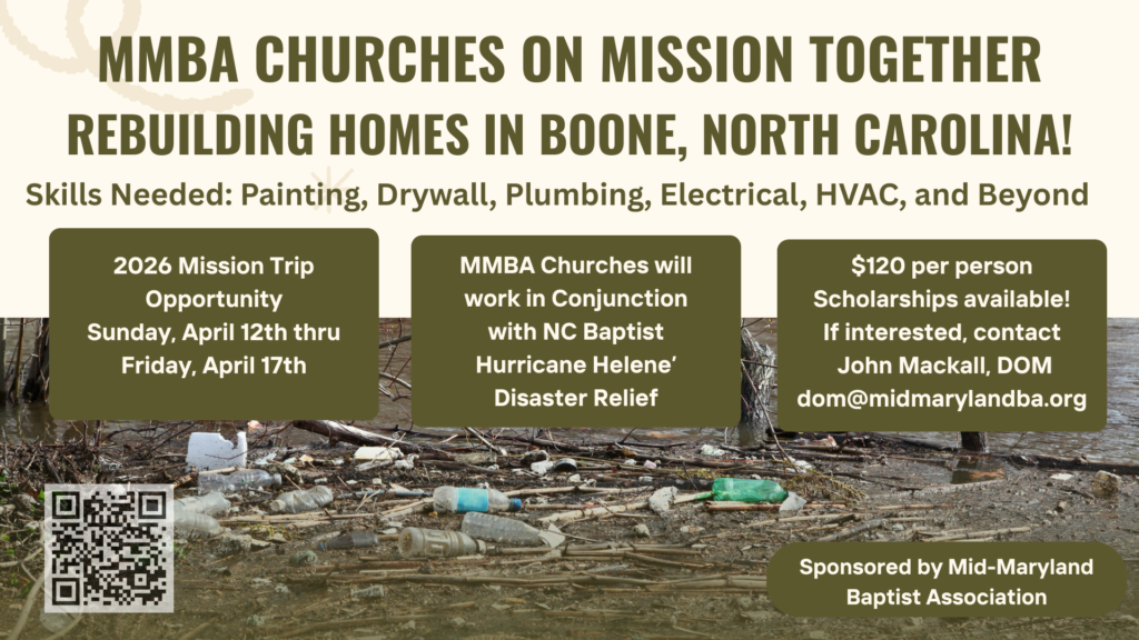 We invite individuals, church groups, and skilled workers from across the Mid-Maryland Baptist Association to prayerfully consider joining this trip. Your time, gifts, and presence will provide tangible relief and gospel hope to families deeply affected by this disaster.